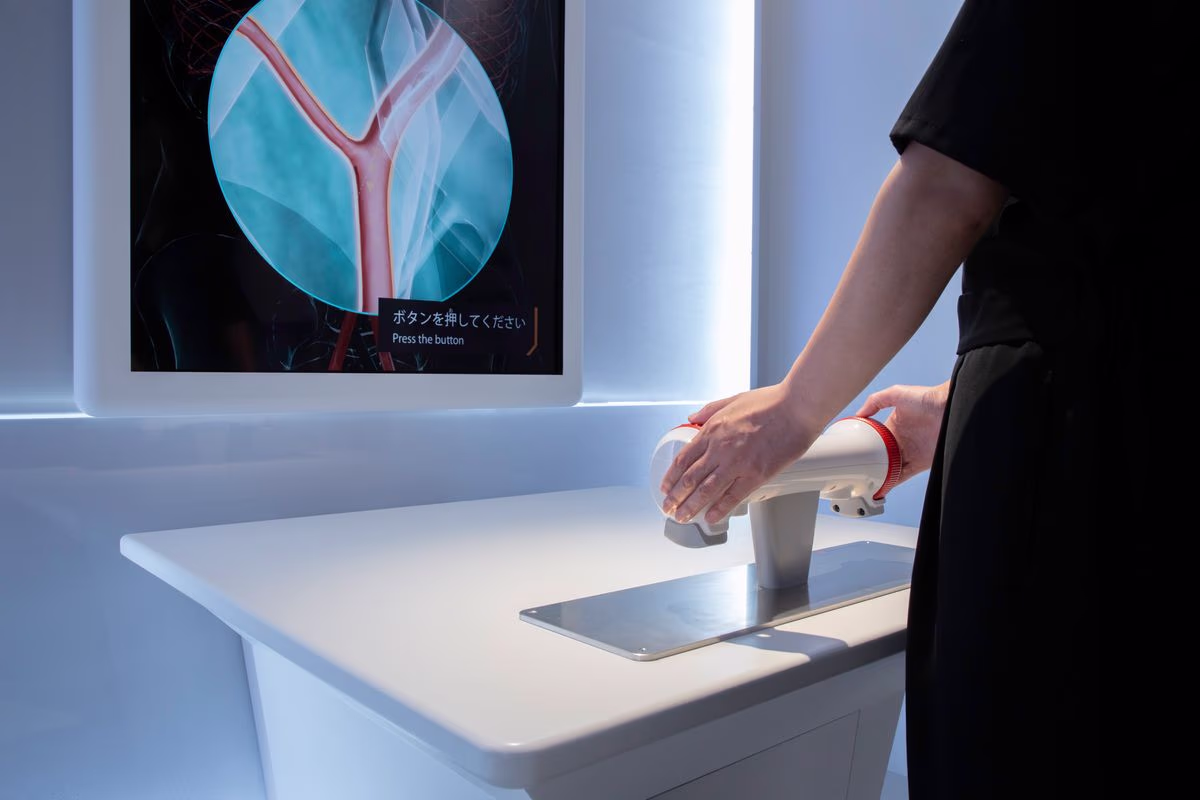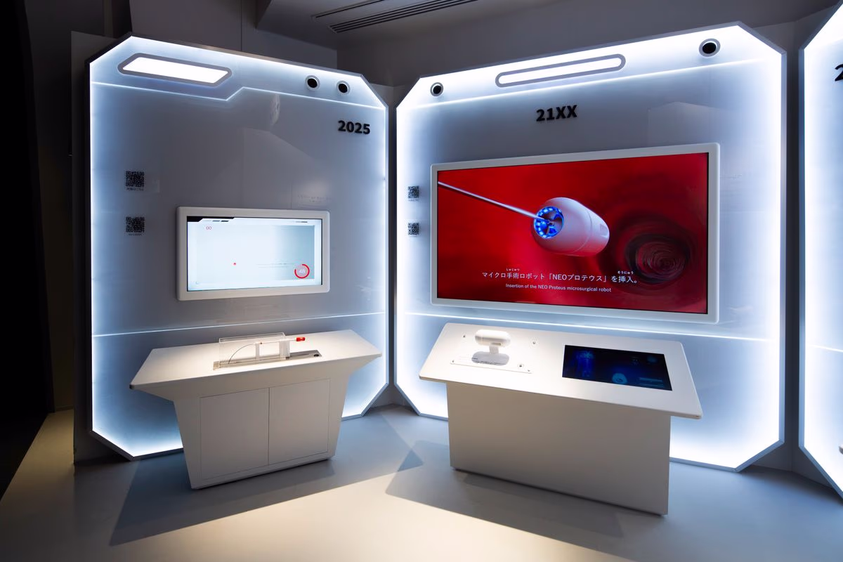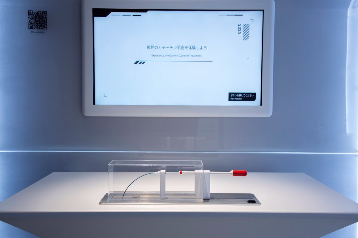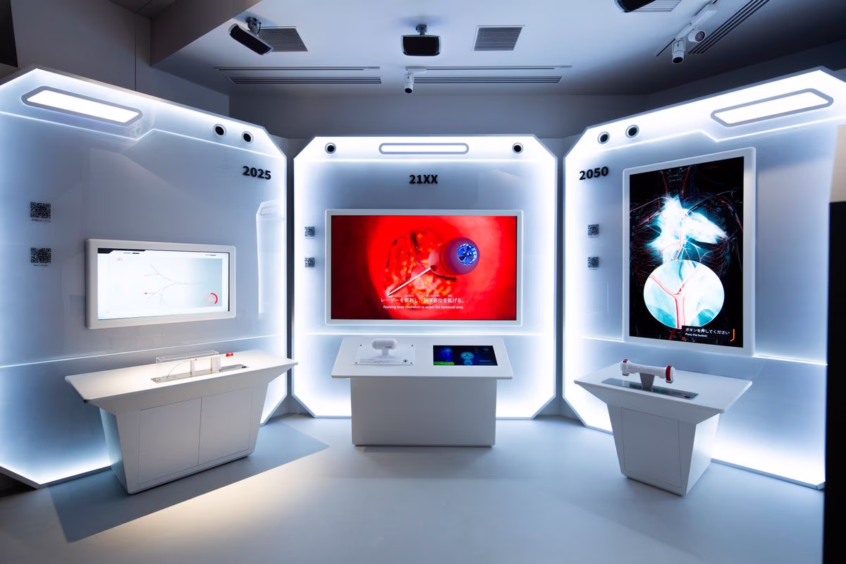 Exhibited within the Pasona Pavilion at Expo 2025, this installation showcased Asahi Intecc’s world-leading PCI guidewire technology used in cardiac catheterization procedures. The design expressed a vision of future medicine by first introducing visitors to the current medical applications of guidewires, then inviting them to engage with interactive experiences that imagine the treatments of tomorrow. Custom-built interfaces and game-based content allowed visitors to explore advanced medical techniques in an immersive and accessible way.
